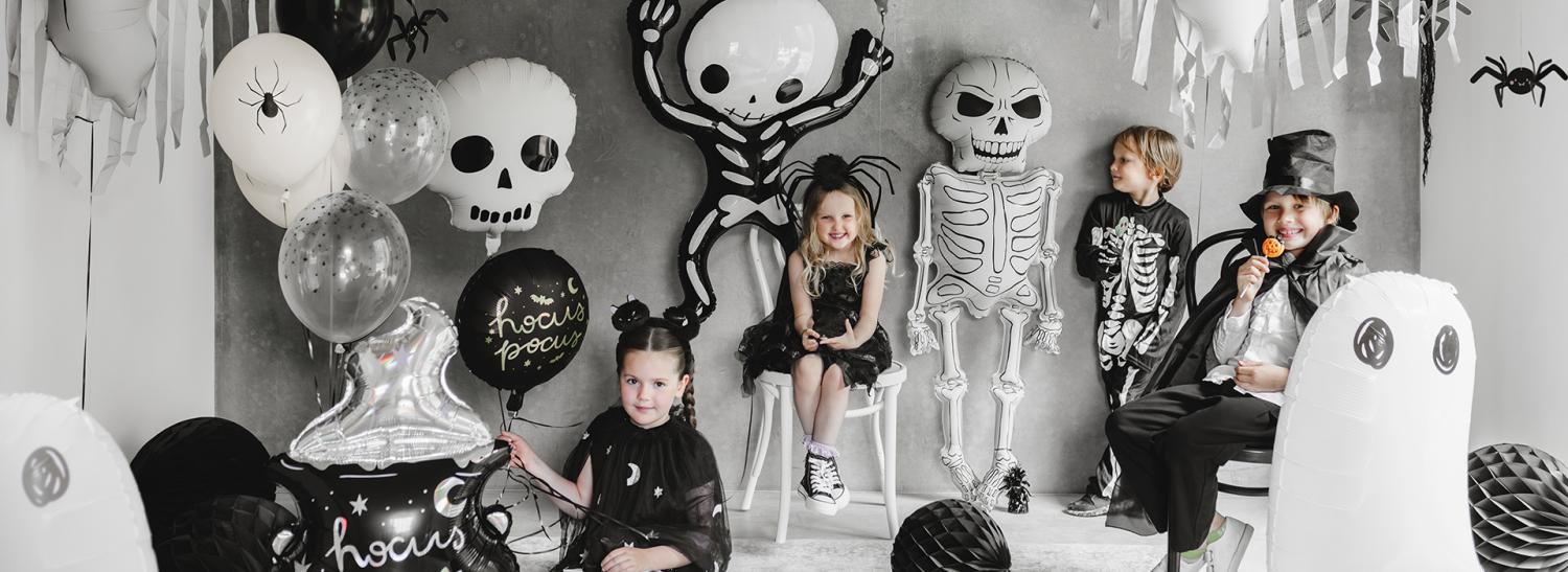 Läskigt roliga ballongbuketter i orange, svart och spökliga detaljer. Skapa en festlig och spännande halloweenkänsla hemma eller på festen!