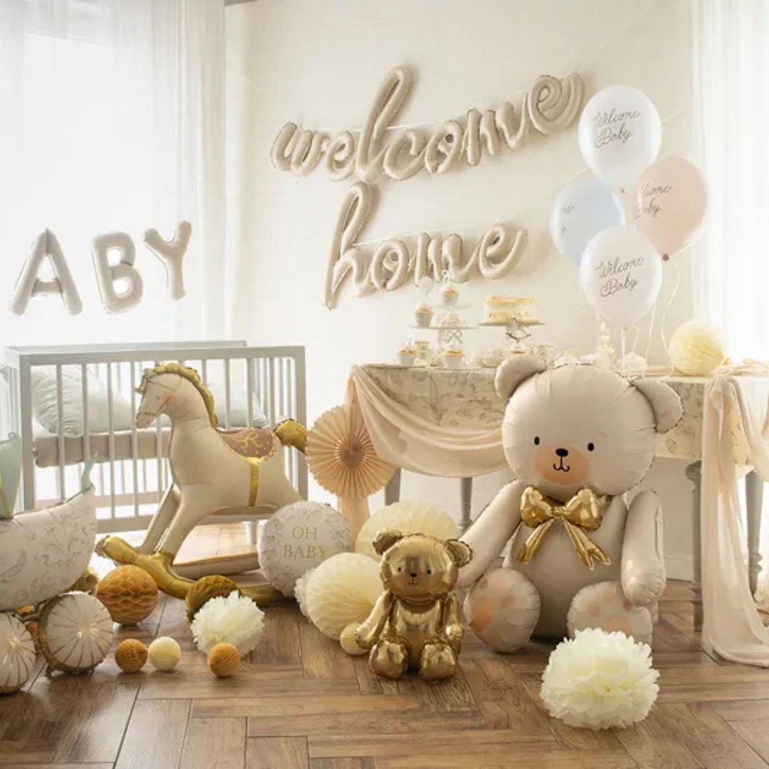 Låt festen galoppera i väg med denna gunghästformade folieballong! Med sina mjuka beige- och skimrande gulddetaljer blir den en söt och stilfull dekoration som passar perfekt till babyshower, dop, födelsedagar eller barnkalas. Ballongen fylls enkelt med luft och står stadigt på golvet, så ingen helium behövs. Den charmiga gunghästen blir snabbt festens mittpunkt och sprider glädje och lekfull stämning i rummet.