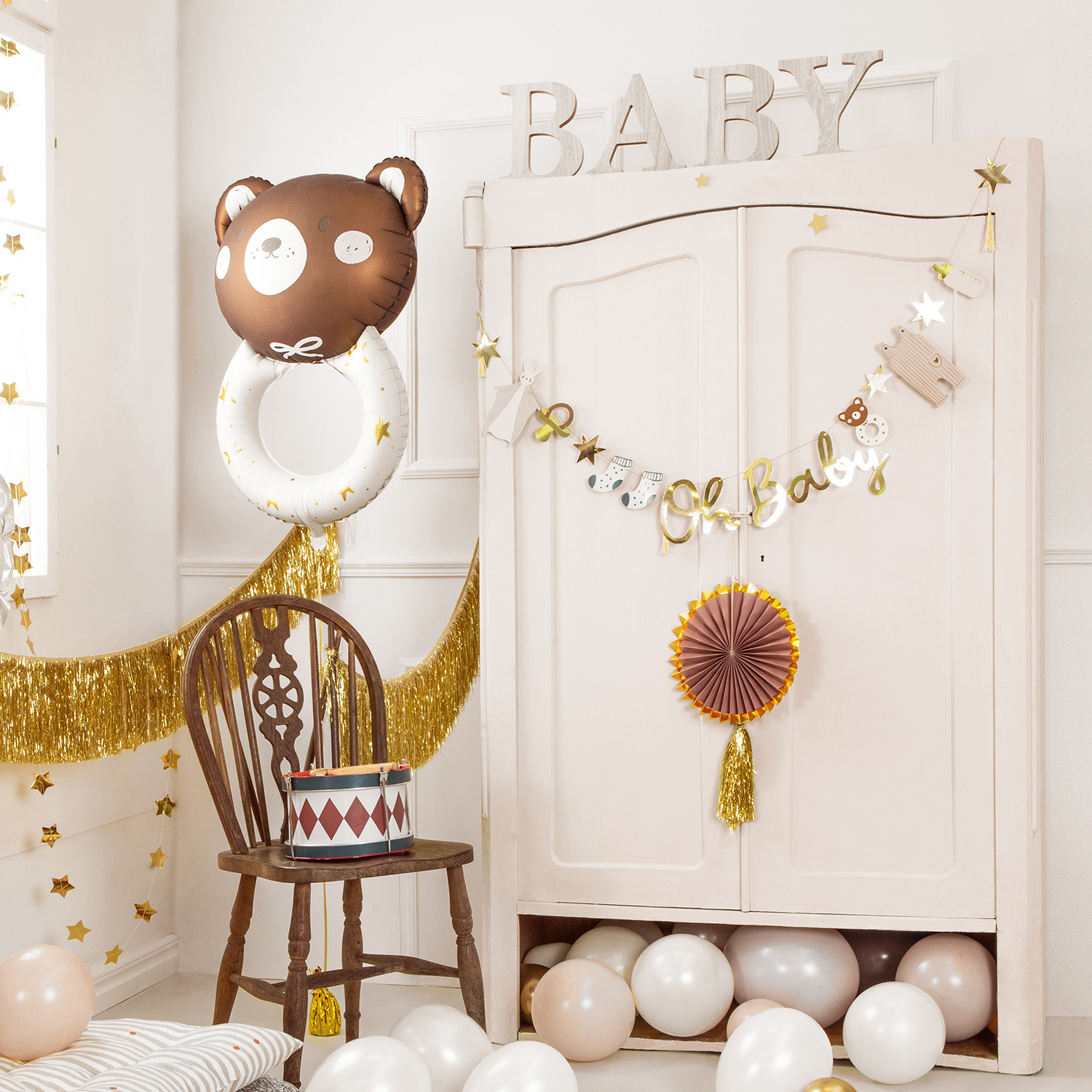 Vi tycker man ska fira så fort man får chansen och självklart tycker vi att ballonger ska vara en del av dekoren till babyshower eller kalas till den lille! Denna ballong är fin som den är såklart men passar så grymt bra tillsammans med andra ballonger i en ballongbukett så köp gärna till några fina latexballonger eller kom in till oss på Sveavägen i Stockholm så hjälper vi dig! Om du vill att vi fyller ballongen med helium så att den flyger köper du till det - den korrekta heliumvolymen med pris hittar du som en Relaterad artikel - observera att heliumfyllda ballonger bara kan hämtas/levereras i Stockholm. Vill du själv fylla din ballong med helium köper du till engångshelium som finns under Tillbehör - helium. Tuben räcker till flera ballonger och kan levereras till hela Sverige.