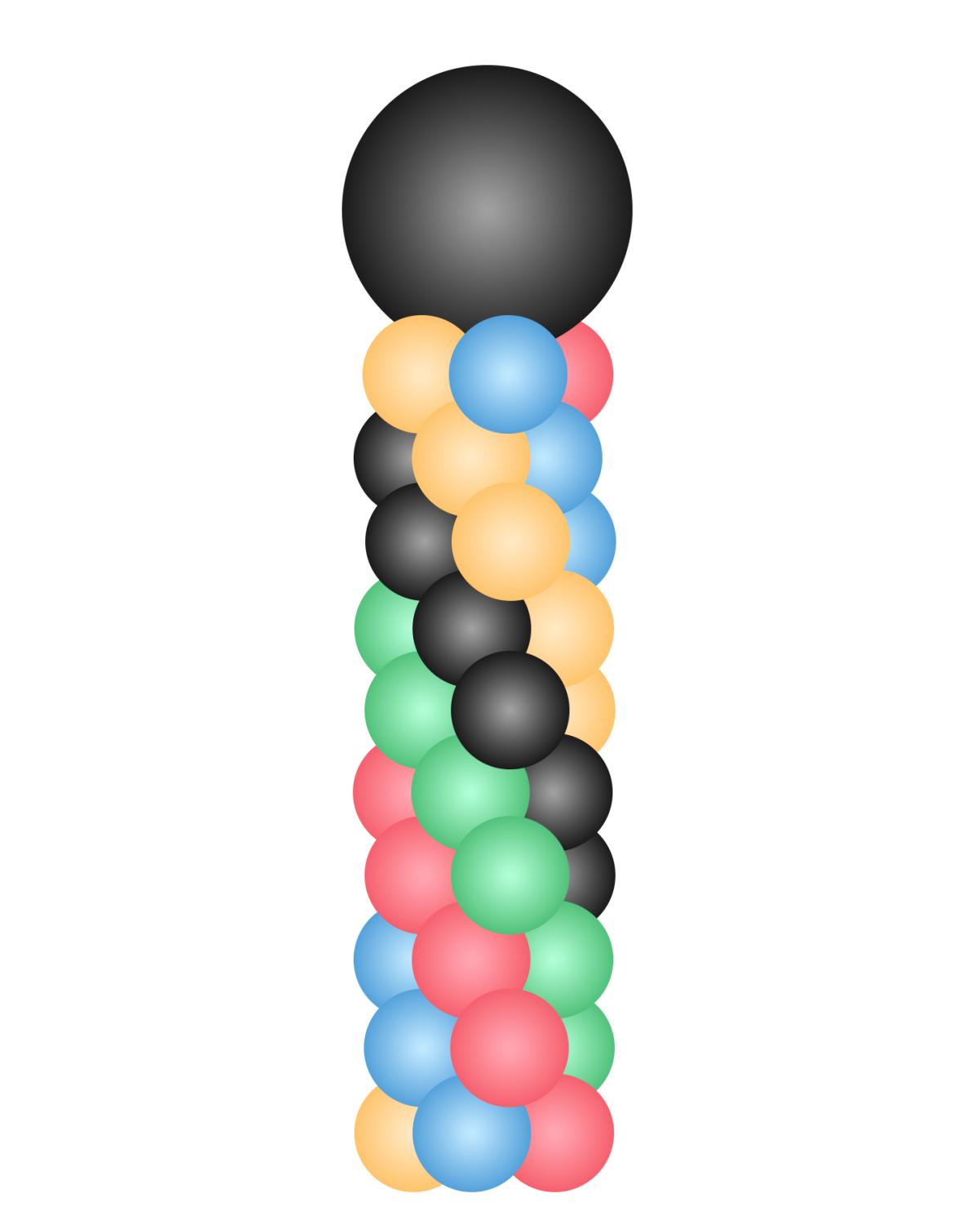 Pelaren kommer komplett med en ställning (som är till låns) och kan med fördel beställas för upphämtning/bud ett par dagar innan festen. Ballongpelare 501 har 5-kluster av ballonger i varje lager, vilket gör att pelaren passar för dig som vill ha 5 färger i ett spiralmönster. (T.ex. OS-färger, se bifogad exempelbild.) Vill du ha 1-4 färger i din ballongpelare rekommenderar vi att du väljer Ballongpelare 401.