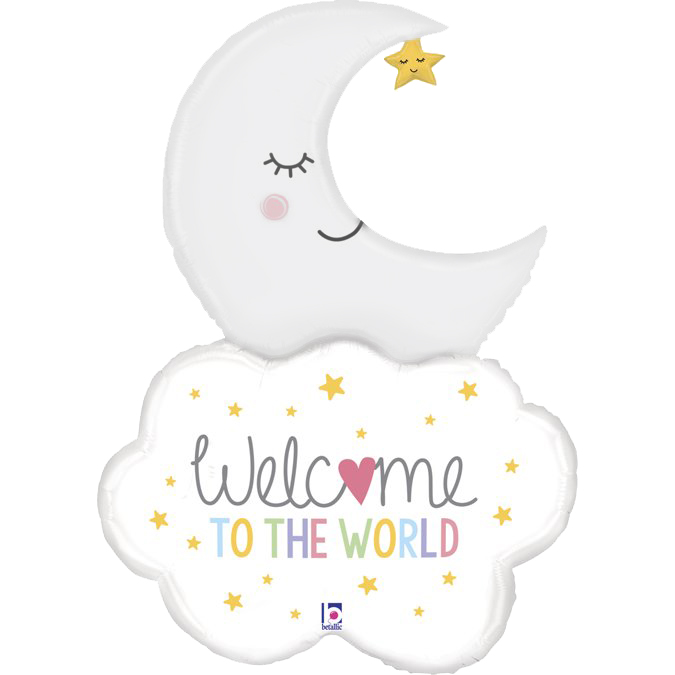 En gullig ballongbukett i pastellfärger, för att välkomna det nya livet till världen. Buketten med bebis, måne och moln med texten "Welcome to the world" passar bra till babyshower, gender reveals eller när det är dags att träffa lilla bebisen för första gången!