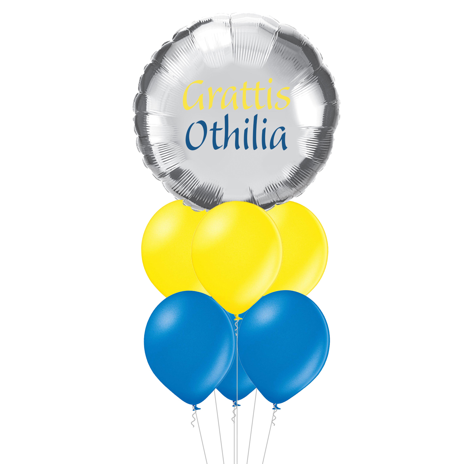Innehåller: Samtliga ballonger fyllda med helium, text, matchande snöre och ballongtyngd.