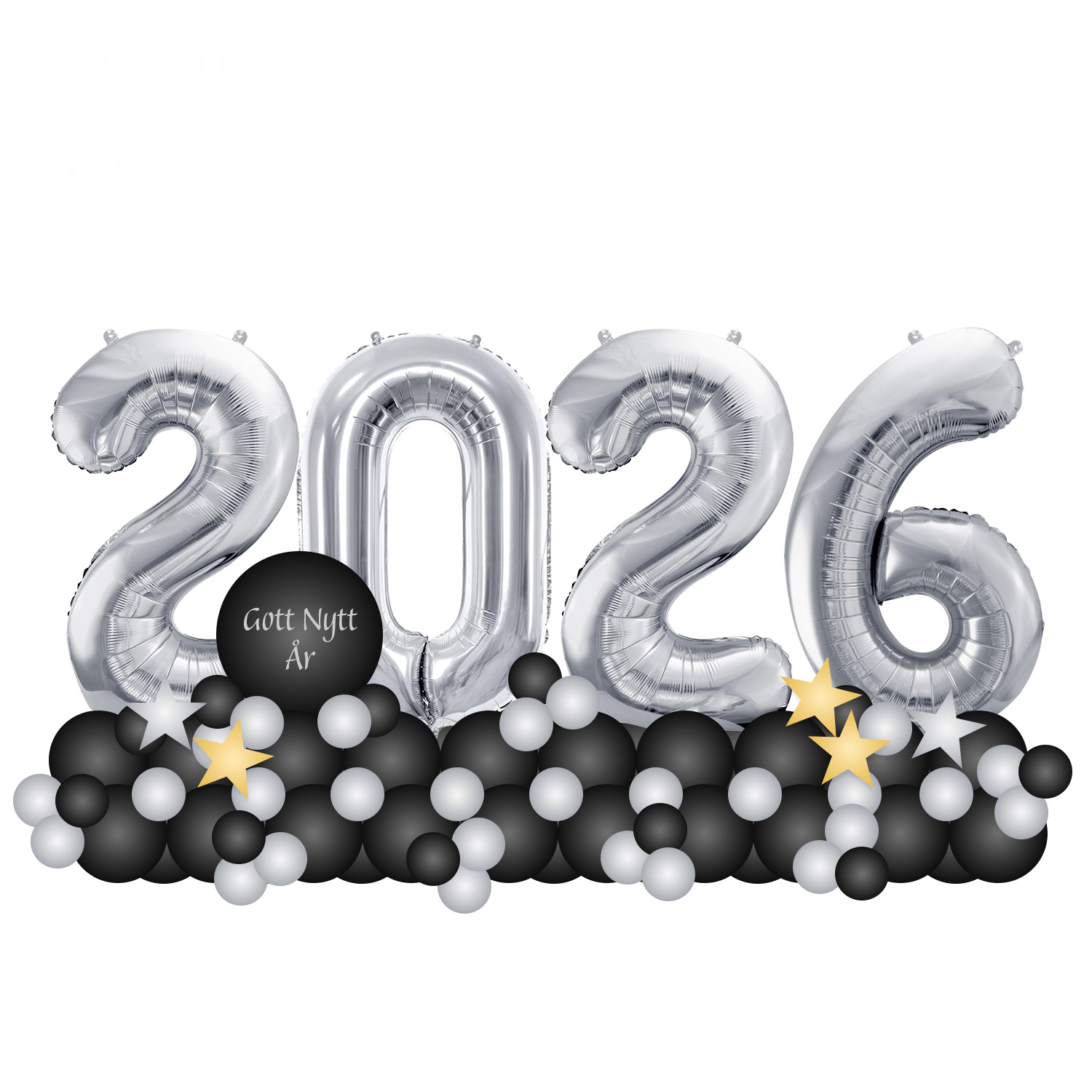 Organisk ballongdekor till nyårsfesten inför 2026! Ballongdekoren innehåller 4st foliesiffror, 1st rund folieballong med text, 5st foliestjärnor och latexballonger.