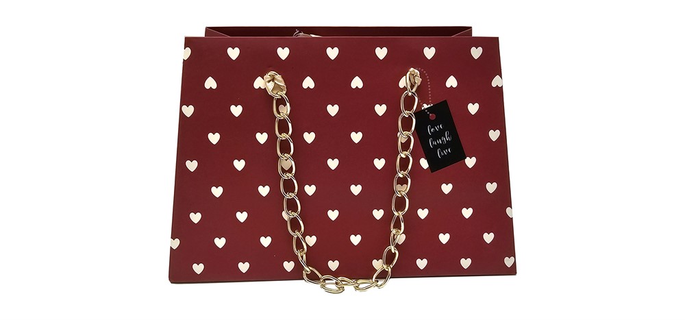 Den röda färgen med vita hjärtan skapar en varm och kärleksfull känsla, medan det guldfärgade kedjehandtaget ger en elegant och lyxig touch. Perfekt till Alla hjärtans dag, födelsedagar, bröllop eller när du vill visa lite extra omtanke. En stilfull presentpåse som förvandlar varje gåva till något alldeles extra.